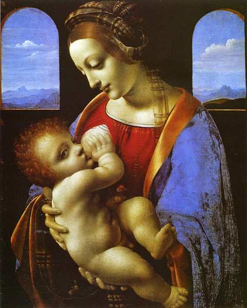 Полная задумчивости, нежная и умиротворенная, мать любуется на дитя, сосредоточив во взгляде всю полноту своих чувств. В картине «Мадонна Литта» (около 1480, Государственный Эрмитаж, Санкт-Петербург) Леонардо удалось создать выразительный женский образ практически с помощью единственного жеста. Без легкого наклона головы, столь свойственного многим работам мастера и который он так часто изучал в своих подготовительных рисунках, ощущение безграничной материнской любви во многом бы пропало. Только тень в уголках губ Марии словно намекает на готовую возникнуть улыбку, но сколько нежности это придает всему лицу!