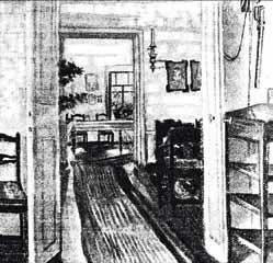 Комната в доме родителей А. С. Попова. В правом верхнем углу рисунка видна часть «электрического будильника» Саши Попова. (Зарисовка с натуры Августы Степановны Капустиной, сестры изобретателя.)
