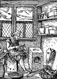 Словолитец изображен в тот момент, когда он зачерпнул ложкой расплавленный металл из котла и заливает его в форму, представленную в виде небольшой усеченной пирамиды, стоящей на ладони левой руки мастера.