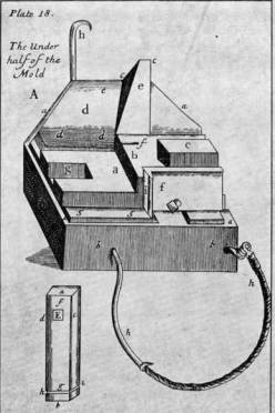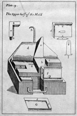 Словолитная форма, по Моксону, составлена из двух металлических деталей сложной формы — нижней и верхней. Деревянная рубашка 6, прикрепленная к деталям, позволяла словолитцу брать форму в руки в момент заливки в нее расплавленного металла. Нижнюю и верхнюю части формы складывали таким образом, чтобы выступы с входили в пазы g. Пирамидообразный литник при этом образовывали скошенные плоскости d и е, а рабочая полость возникала между плоскостями а. К отверстию в нижней части полости прижимали матрицу fg с углубленным рельефным изображением Е шрифтового знака. Матрица фиксировалась плоскостями i, i формы. Точное положение очка обеспечивала юстировочная игла h, крепившаяся на поводке. Иглу вставляли в отверстие в задней плоскости матрицы.