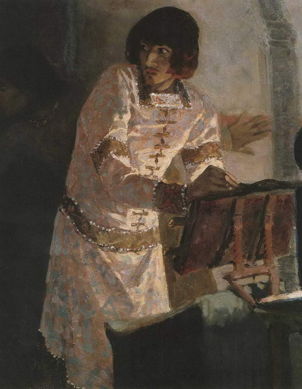 На полотне Князь Борис перед убиением один из этих братьев изображен в белом одеянии, расшитом золотом, прекрасном и светлом, как символ будущей святости, за несколько мгновений до своей насильственной смерти, на которую его обрекли властолюбивые и жестокие родичи. Его рука еще лежит на Священном Писании, в чтение которого он был погружен несколько минут назад, но глаза, поворот головы и вся фигура выражают предчувствие трагического конца. Сзади, в открывающейся двери, вырисовывается силуэт убийцы, а на стене отражается тень крадущейся руки насильника.
