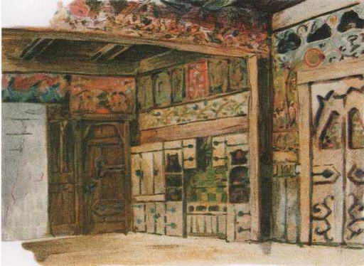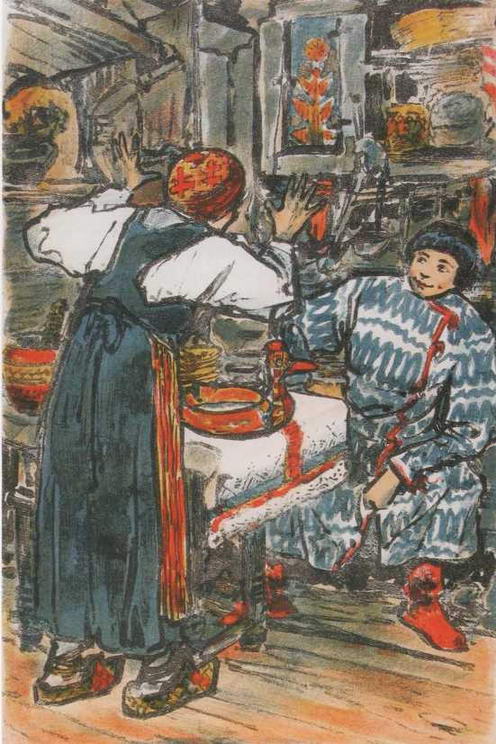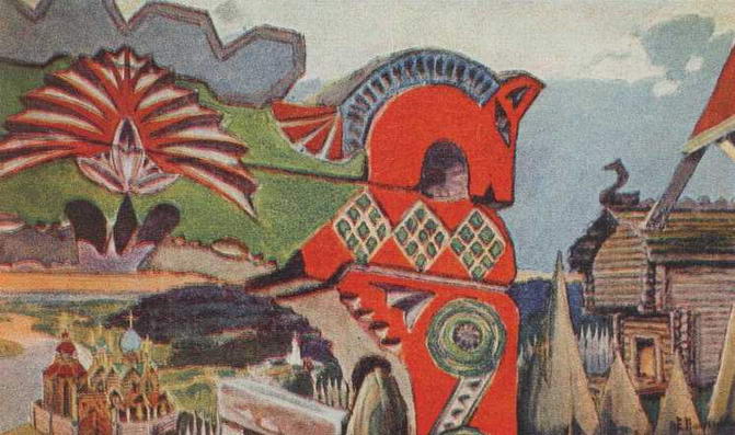 Первый сюжет художница взяла из истории дохристианской Руси. Великолепно, с глубоким знанием старинной архитектуры она изобразила праздник Масленицы в деревянном древнерусском городе.