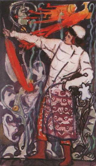 Поздравительный адрес Антокольскому М.М. Иван-царевич с пером Жар-птицы в руках 1896