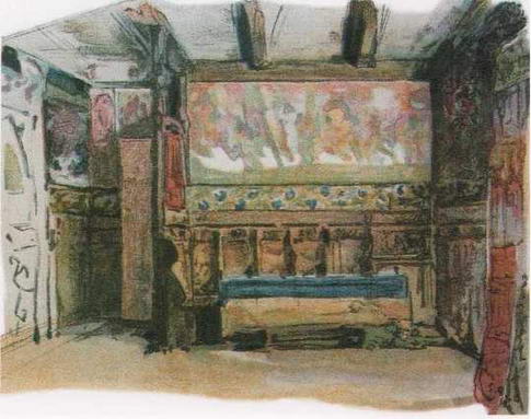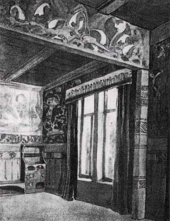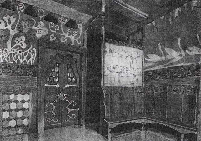 Одну из стен проекта Русская столовая занимало панно Е.Д. Поленовой Цвет папоротникам Жарптица, другую стену - панно Лебеди, выполненное А.Я.Головиным, которому предстояло одному завершать этот проект. Оставшиеся поверхности стен были украшены декоративным орнаментом и резьбой по дереву.