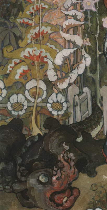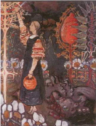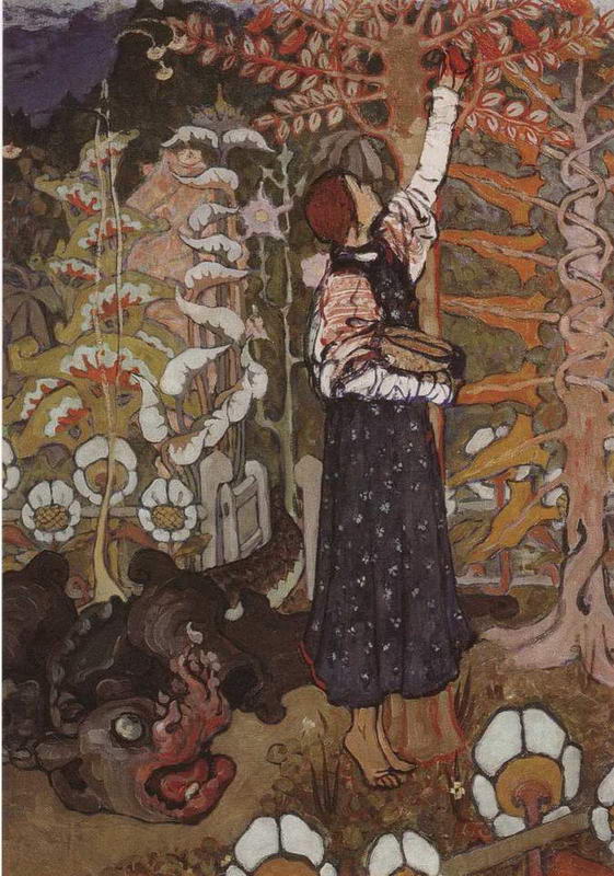 Молодая девушка в русском наряде зашла в сад и, приподнявшись на цыпочки, рвет с дерева плоды. Очаровательная и грациозная, спокойная и радостная, она не замечает чудовищно страшного зверя, который подползает к ней через открытую калитку.
