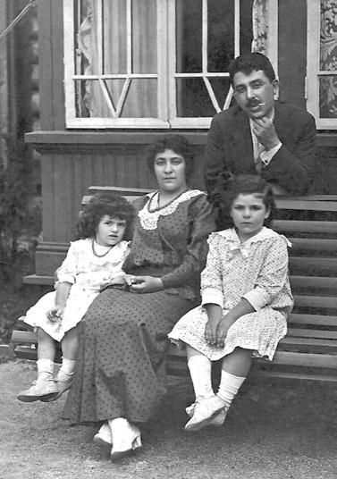 Не знаю где стоял тот дом, который бабушка покидала таким экстравагантным способом. Но вот на карточке, где дедушка, бабушка, моя мама (старшая — Оля) и её сестра Ида, деревянное дачное строение. Мама рассказывала, что семья постоянно снимала в Усть-Нарве дачу Милинга. Но когда через много-много лет мы пытались найти её, и спрашивали жителей предполагаемого района, наши усилия оказались тщетными. Помнила мама, что они переплывали на лодках через реку, шли на мельницу, и там их кормили свежими булками с молоком. А ещё няня водила их с сестрой гулять на площадь перед курзалом. Там танцевала местная молодёжь.