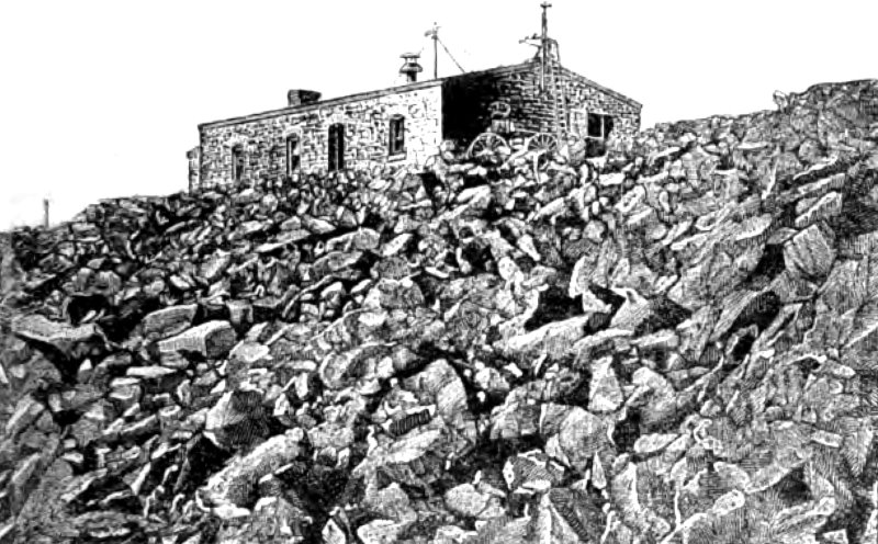 На самой вершине стоить небольшой, низенький, но весьма прочно построенный каменный дом, где теперь мы могли утолить голод бутербродами, но тут еще в 1888-м году помещалась метеорологическая обсерватория, самая возвышенная в свете. Она действовала целых 15 лет, с 1873 по 1888 г., и собранные наблюдения привели к весьма интересным результатам. Например, времена самых сильных ветров совпадают здесь с временами самой низкой температуры, что, как известно, совершенно обратно тому, что наблюдается в равнинах. Здесь, на вершине Пайкс-Пика, ветер обыкновенно днем слабее, чем ночью, в равнинах же бывает наоборот. Понятно, что такие метеорологические условия делали пребывание наблюдателей весьма тяжелым: зимою наиболее низкая температура совпадала с самым сильным ветром. О силе же здешних ветров можно судить по тому, что нередко случался ветер, скорость которого равнялась 75 верстам в час. Наивысшая из наблюдённых здесь температур была 64°F., наинизшая ?39°F. и средняя годовая температура оказалась 19°F., т. е. около ?6°R. Судя по отчетам обсерватории, особенно интересны наблюдавшиеся тут электрические явления. Обыкновенно после выпадания снега воздух до того насыщался электричеством, что из пальцев вытянутой вверх руки вылетали искры, а вертушка анемометра представлялась светящимся кругом. Однако, за время действия обсерватории, она только однажды подверглась непосредственному удару молнии.