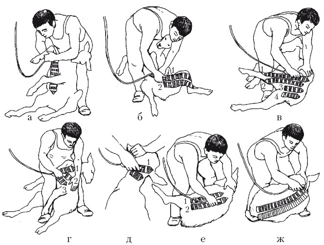 После первых двух коротких проходов стригаль опускает вниз правое колено и слегка прижимает брюхо овцы. Левой рукой поддерживает овцу в приподнятом положении. Чтобы низко и ровно состричь шерсть с боков и на спине и не допустить перестрига шерсти, длинные проходы делают параллельно позвоночнику. На боку и на спине овцы длинные проходы ведут на полный захват гребенки, а на шее – с половинным захватом, поскольку шея по площади уже спины и бока. Во время длинных проходов стригаль удерживает овцу левой рукой позади ушей. Сам он несколько отклоняется назад, левая нога у него согнута. Ступня левой ноги подставлена под правое плечо овцы, а правая нога стригаля находится снаружи крестца овцы. При таком как бы выпуклом положении кожа на овце натягивается и складки на шее расправляются. Проходы машинкой по ту сторону позвоночника овцы в дальнейшем при стрижке правого бока сильно облегчают работу. Малоопытные стригали, делая длинные проходы машинкой, нередко стараются удержать овцу за правое ухо. Это совершенно недозволенный прием; животное испытывает боль, старается вырваться, что нарушает ритм работы. Овцу нужно держать позади ушей, прижимая голову к своей левой ноге (рис., ж).