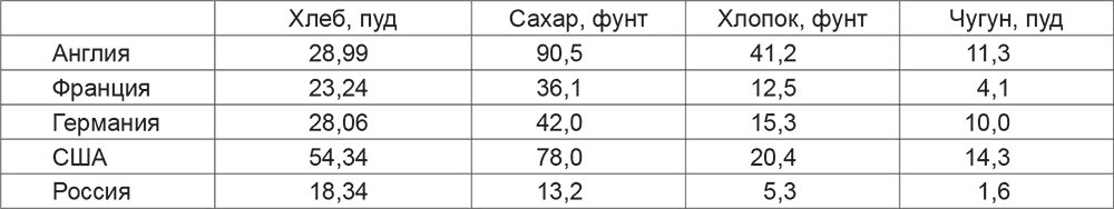 «Благодаря свой бедности, хозяйственной и духовной отсталости, русский человек потреблял до войны очень незначительное количество различных продуктов по сравнению с развитыми европейскими странами. Это ясно из следующих цифр о среднем потреблении русским человеком в 1904 г.: