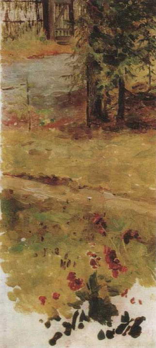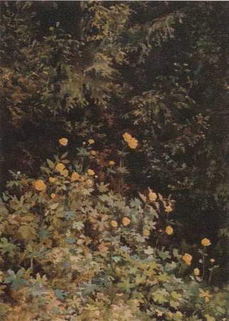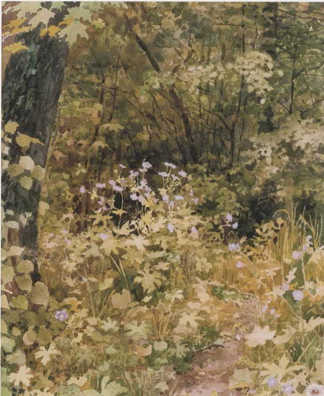 Пейзажи начала 1880-х годов Поленова посвятила дикорастущим цветам. Достаточно взглянуть на ее акварели или просто прочитать их названия: Цветы, Ромашки, Мальвы, Маки, Цикорий, Желтые цветы, Купавки ~ чтобы понять, как милы и дороги ей эти скромные, но поэтические и грациозные незабудки, мальвы, маки, ромашки, люпины, купавки и даже горьковато терпкие соцветия тысячелистника.
