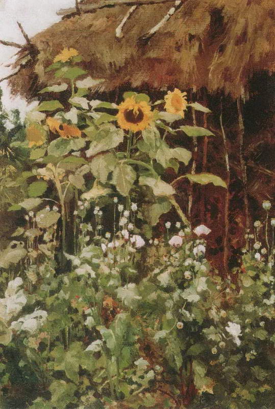 Картина Подсолнухи, написанная Поленовой маслом, притягивает и завораживает своей теплотой, жизнерадостностью и сочностью колорита. Великолепные, огромные соцветия подсолнечника с крупными желтыми лепестками, с созревающей темной серединой и бархатнозелеными листьями изображены на фоне покрытой соломой крыши, но кажутся первозданными. Дикорастущий подсолнечник завезен в Европу в 1510 году испанцами из Северной и Южной Америки. В нашу страну подсолнечник попал в XVIII веке. В 1833 году Россия первой в мире наладила промышленное производство подсолнечного масла путем отжима семечек. Но еще очень долго после этого в русских деревнях подсолнечник выращивался не только ради излюбленного лакомства - семечек, но и для красоты. Считалось, что цветы подсолнуха приносят здоровье, радость и счастье. Именно такими изобразила подсолнухи Елена Поленова. Высокие стебли подсолнухов на ее этюде закрывают другие цветы: белые бутоны и цветы астр, а еще ниже - оранжевые настурции и яркокрасные маки.