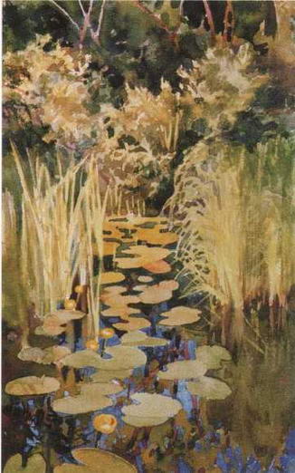 Уголок подмосковного пруда на акварели Поленовой зарос осокой и камышом, но в его воде отражается и дрожит чарующая синева неба, а плавающие на поверхности воды крупные листья и желтые цветы кувшинок, или водяных лилий - царственно прекрасны.