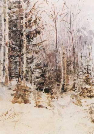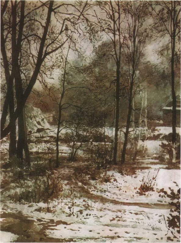 Зимний пейзаж. Опушка леса - одна из лучших акварелей Елены Поленовой. Еще зима, морозно и холодно. Небо затянуто сизыми облаками. На ветвях голых деревьев дремлет одинокая ворона. Но оттепели уже были, и они обнажили кусты с красно-бурой и рыжей прошлогодней листвой. В жемчужно-серой дымке февральского дня лес кажется чарующей, дивной сказкой.