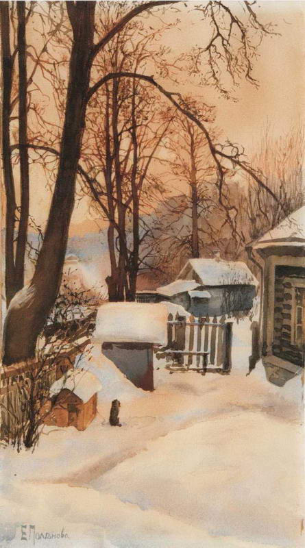 Трепетным восторгом перед красотой зимнего пейзажа в деревне проникнута акварель На дворе зимой. Зимнее солнце ясного морозного дня золотит небосклон, дивные лесные дали, ветви ближайших деревьев и обычных деревенских построек. Одухотворяя и поэтизируя повседневную жизнь, ее связь с природой, художница передает в этом пейзаже ощущение гармонии и красоты мироздания. Пейзаж звучит как возвышенная и торжественная музыка. Про него можно сказать: это музыка, застывшая в красках, столько в нем звучности колорита. На дворе зимой - одна из тех работ Е.Д. Поленовой, которую сразу приобрел для своей картинной галереи знаменитый коллекционер П.М. Третьяков, что очень вдохновило художницу.