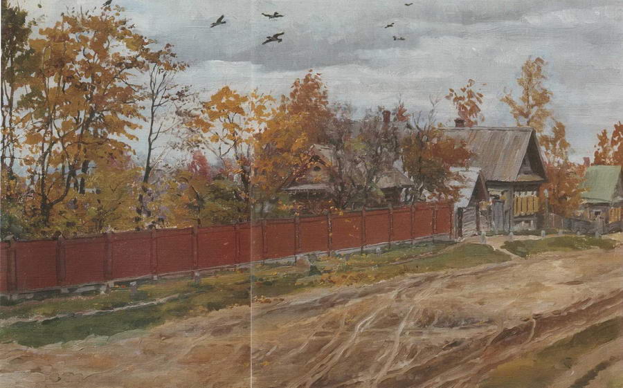 В 1888 году Елена Поленова под впечатлением своей поездки в город на Волге создает один из самых очаровательных своих пейзажей Улица в Костроме. Художница облюбовала уютную улицу старинного русского города. Если в этюде Калитка тропинка среди алых цветов и нескольких елей манит к бревенчатому забору, заставляя зрителей домысливать все, что может таиться за ней, то в картине Улица в Костроме широкая дорога вдоль бревенчатых домиков и невысокий палево-коричневый забор лишь подчеркивают красоту осеннего пейзажа. Художница тщательно вырисовывает небольшие деревянные домики с покатыми крышами и деревянными ставнями, которые утопают в роскошном золоте и багрянце осенних садов. Сохранившаяся зелень травы и кустов великолепно сочетается с зеленью крашеных крыш, а золото листвы - с распахнутыми желтыми ставнями, как будто напоминая о возможности гармонии красоты мироздания и человеческой жизни. И над всем этим чарующим великолепием в серо-жемчужном осеннем небе, распластав крылья, грациозно парят птицы.
