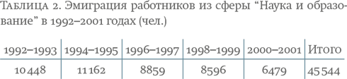 Особенностью методического подхода, принятого в МВД, является то, что наряду с эмиграцией работников из сферы науки здесь также ведется учет эмиграции из сферы образования, т. е. фиксируется суммарная эмиграция из объединенной сферы, обозначаемой «Наука и образование» (см. табл. 2).