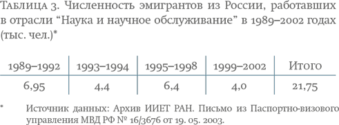 Согласно статистическим данным, за 14 лет (1989–2002 годы) на ПМЖ выехало около 22 000 работников отрасли «Наука и научное обслуживание», включающей не только собственно ученых (исследователей), но и научно-вспомогательный персонал научных организаций (лаборанты, работники библиотеки и др.). Таким образом, за 14-летний период собственно ученых (исследователей) уехало еще меньше, чем из отрасли в целом. Сколько же их эмигрировало за этот период?
