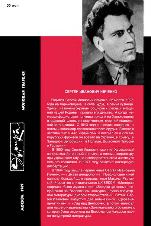В 1964 году вышла первая книга Сергея Ивановича Ивченко — «Цiкава дендрологiя». Предисловие к ней написал большой друг природы поэт Максим Рыльский. Через год в издательстве ЦК ВЛКСМ «Молодая гвардия» была издана книга «Загадки цинхоны», получившая на Всесоюзном конкурсе научно-популярной литературы диплом второй степени. Затем Сергей Иванович выпустил две новые книги: «Деревья-памятники» и «Сад над Днепром», а потом написал для нашего издательства «Занимательно о ботанике», которая была отмечена на Всесоюзном конкурсе научно-популярной литературы.