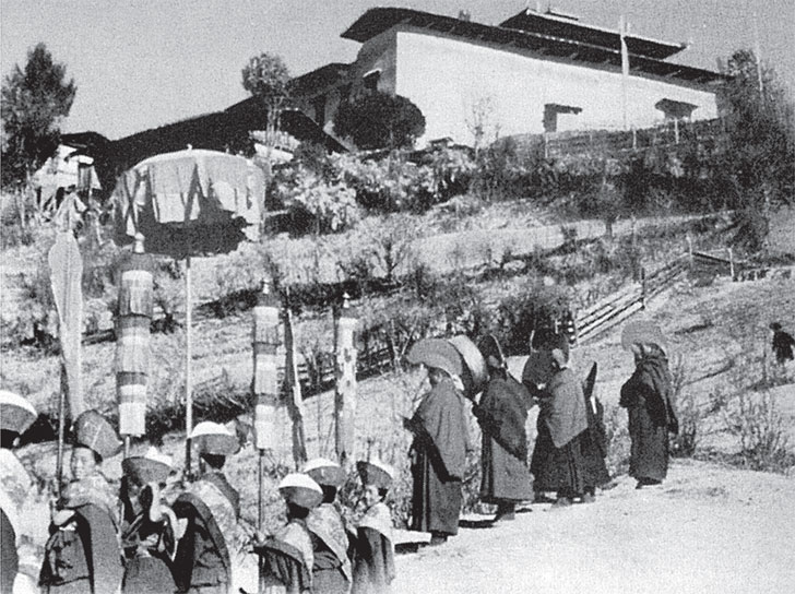 Огромный телескопический духовой инструмент, дуя в который монахи возвещают о прибытии Божественного Правителя
