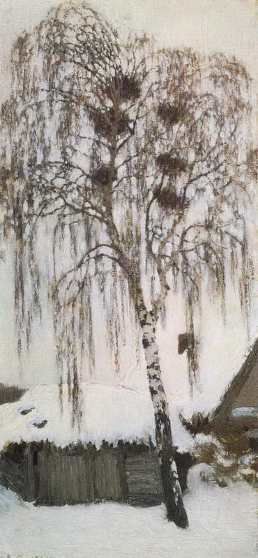 В Дугине Грабарь начал писать этюды снега с близкого расстояния - для его изучения. Бродить вокруг усадьбы и наблюдать стало главным его занятием. Первой значительной работой, написанной здесь, стала картина Белая зима. Грачиные гнезда (1904), мотив которой был найден в деревне Шестово недалеко от усадьбы Мещериных. Красота высоких плакучих берез, усеянных шапками гнезд подчеркнута утонувшей в снегу избушкой. Гармония тональных отношений в картине порождена светом зимнего серебристого, бессолнечного дня. «Хотелось передать эффект белого снега на белом небе, с белой березой. Эта белизна без белильности, кажется, удалась», - писал Грабарь[4 Там же, с. 201.]. На выставке трудность задачи и удачное ее разрешение оценил Валентин Серов, который отметил, что «зима - действительно белая, а белил не чувствуешь»[5 Там же.]. В этом сработал способ смешивания красок на холсте, а не на палитре, уже опробованный в Сентябрьском снеге. «Живопись Сентябрьского снега была действительно переломной для меня. Будучи где-то посредине между прежней, пленэрной, и новой, импрессионистической установкой, она казалась не совсем обычной, хотя о настоящем разложении цвета, о “дивизионизме” в отношении к ней еще речи быть не может», - писал художник[6 Там же, с. 197.].