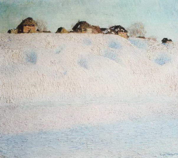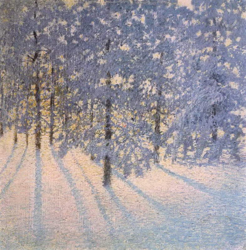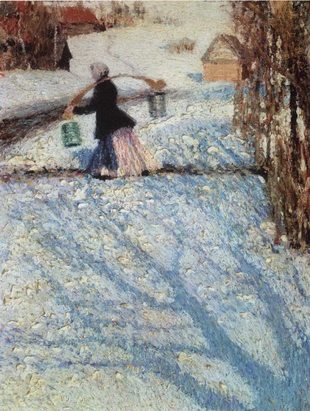 Освоение зимней темы во всей ее живописной специфике происходило постепенно, с накоплением наблюдений. Побывав в Яхроме у художника Сергея Иванова, в снежных просторах, напомнивших Грабарю северную природу, он «впервые познал красоту бесконечных бирюзово-сиреневых переливов на снегу»[1 И.Э. Грабарь. Моя жизнь, с. 195.]. Французский импрессионизм дал Грабарю прежде всего возможность по-новому видеть и анализировать живописный материал, а уже затем и технику воплощения увиденного на полотне. Одним из важнейших для него приемов стал «дивизионизм» - прием разложения цвета на холсте.