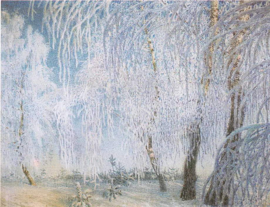 Там же в Титове Грабарь открыл для себя еще один из главных мотивов своих будущих картин - иней. Глазу художника открылось фантастическое зрелище, которое он называл «сказкой». «Бриллиантовые кружева на бирюзовой эмали неба» - такое определение инею мог дать только художник. Но Грабарь открыл и еще одну особенность инея - его мимолетность, которая заставляла особенно спешить с работой,чтобы уловить минуты быстротечной красоты.