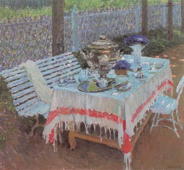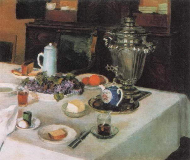 «Чайные» натюрморты после Константина Коровина на рубеже веков стали популярны среди московских живописцев. Грабарь внес в этот жанр много изысканных решений - и колористических, и композиционных. Послеобеденный чай и Утренний чай, большая картина, находящаяся в Национальной галерее в Риме (обе - 1904), стали первыми в ряду подобных работ. Картина За самоваром (1905) была написана в тот час, когда дневной свет переходит в голубые сумерки. Это предвечернее освещение дало особую жизнь живописным эффектам - тлеющему огоньку самовара, блеску его металлической поверхности, игре голубых рефлексов в хрустальном стекле. Да и девушка, сидящая с чашкой у самовара, включена в эту живописную стихию - последний луч света позолотил ее волосы и щеку. Здесь мы впервые видим будущую жену художника и героиню многих его портретов, старшую дочь художника Михаила Микешина Валю.