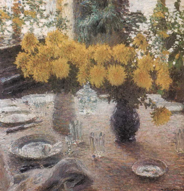 Соединение «цветочного» и «чайного» натюрмортов со всеми их фактурными, цветовыми и световыми особенностями произошло в картине Хризантемы (1905). «Я давно уже подбирался к хризантемам, и хорошие экземпляры этого цветка ускорили появление картины», - писал Грабарь[1 И.Э. Грабарь. Моя жизнь, с. 212.]. Действительно, на полотне изображены роскошные золотые цветы, специально выбранные у известного московского торговца Ноева.