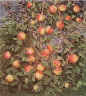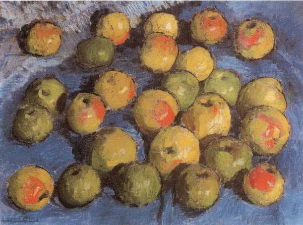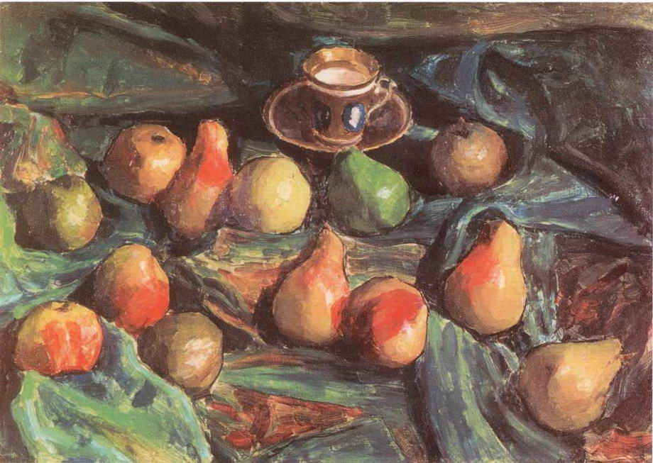 Основная пластическая и цветовая тема натюрмортов 1920-х годов возникала из сочетания разных фруктов и тканей, на которых они располагались. Множество натюрмортов, в которых напряженный ритм и пластика объемов, контраст фактур сочетаются с многообразием и насыщенностью колорита, противопоставлением горячих и холодных цветов, можно назвать «драматическими» (Груши на зеленой драпировке, 1922; Красные яблоки на синей скатерти, 1920; Туркестанские яблоки, 1920). «Меня в то время особенно волновала благородная красота расцветки груш-дюшес - от зеленой через зелено-оранжевую, к темнокрасной»[1 И.Э. Грабарь. Моя жизнь, с. 286].