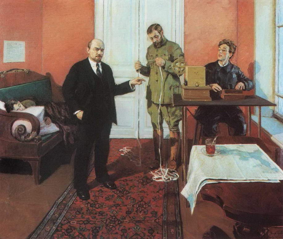 При всей очевидной и неизменной «укорененности» Грабаря в камерных лирических жанрах живописи он, как советский художник и государственный деятель, не мог, да и не должен был в своем творчестве обойти сферу ангажированных форм искусства. Первый опыт относится к 1927 году, и вот как об этом писал Грабарь: «При распределении тем Реввоенсовета на картины к десятилетию Красной Армии, я остановился на теме, оставшейся свободной и никого не заинтересовавшей: В.И. Ленин у прямого провода. Я тогда же начал подробно расспрашивать, как происходили эти переговоры Ленина с командующими фронтов в дни гражданской войны. Узнав все подробности, я принялся компоновать эскиз. Побывал в том коридоре Совнаркома, который примыкает к кабинету Владимира Ильича... Я обрадовался, увидав розово-красные стены, тона помпейской красной, и белую дверь, ведущую в какую-то другую комнату. Все это давало интересный в колористическом отношении материал для картины...»[1 И.Э. Грабарь. Моя жизнь, с. 300.] Как видим, Грабарь искал тот творческий импульс, который помог бы ему сформулировать художественную задачу. Однако в этом полотне, как и в другой его известной тематической картине - Крестьяне-ходоки на приеме у В.И. Ленина (1938) - историко-революционная тема была сконцентрирована в образе Ленина, и потому главной задачей художника было портретное сходство и достоверность происходящего, ради чего он много работал с документальными материалами, с бюстом и маской Ленина, с натурщиком. Но эти методы создания картин не были стихией Грабаря.