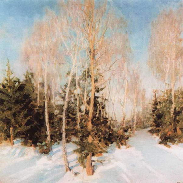 И в выборе пейзажных мотивов Грабарь сохранял прежний живописный темперамент. Вновь и вновь он обращался к зимним мотивам, к неисчерпаемой теме инея - из года в год пишет Роскошный иней и День инея (обе - 1941), Иней (1952), Иней при восходе солнца (1955). В Зимнем пейзаже (1954) свежесть воплощения природного мотива по-прежнему остается подвластной художнику. Он улавливает тончайшие отзвуки небесной синевы в голубых тенях на снегу. Пластический «ключ» пейзажного мотива Грабарь нашел в сопоставлении плотной колючей зелени молодых елей и прозрачной легкости берез, словно вырастающих из еловых зарослей и растворяющихся своими розоватыми кронами в синем просторе. Наряду со снегом его по-прежнему влекло солнце - в одном из абрамцевских писем 1956 года Грабарь писал: «К сожалению, очень мешает работать дождливая погода, а задания у меня, как на грех, все солнечные...»[3 Там же, с. 192.]