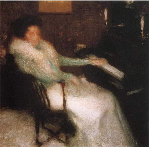 В картине Дама у пианино пастозно написанная женская фигура у рояля не завершена художником и потому в изобразительном решении прежде всего сказывается этюдный замысел. Эта фигура стала воплощением света - ее «световая» роль в пространстве сродни роли канделябров на рояле. Внутренним свечением полны и клавиши инструмента, а лежащая на них рука объединяет эту симфонию цвета в одно целое. Художник пользуется пастозным мазком для усиления этой светоносности форм - свет не скользит по поверхности, а словно «зарывается» в нее, становится материально ощутимым.