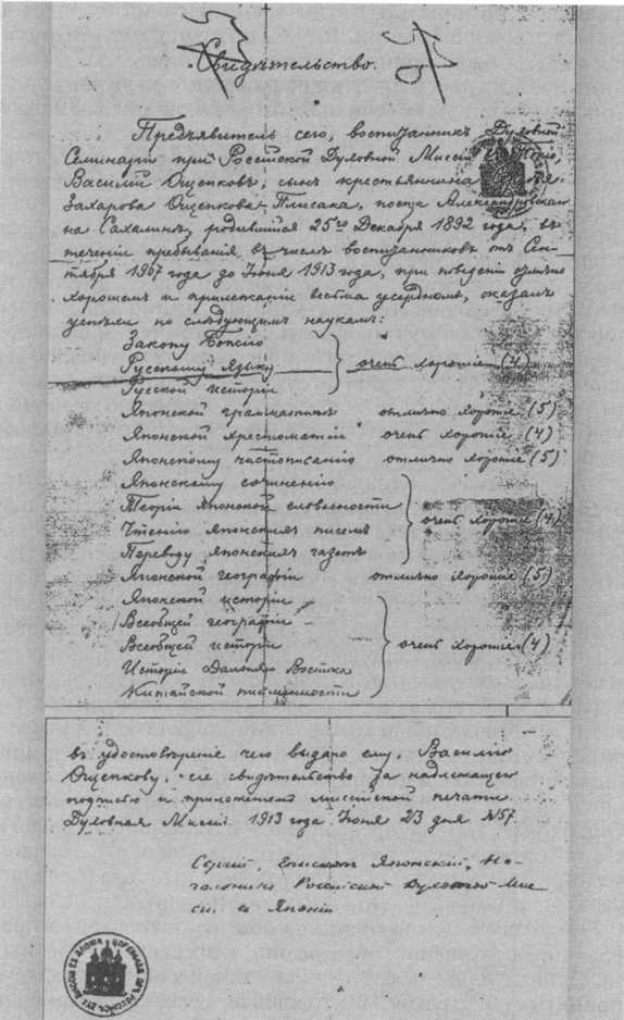 Свидетельство об окончании Ощепковым Токийской православной духовной семинарии.