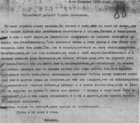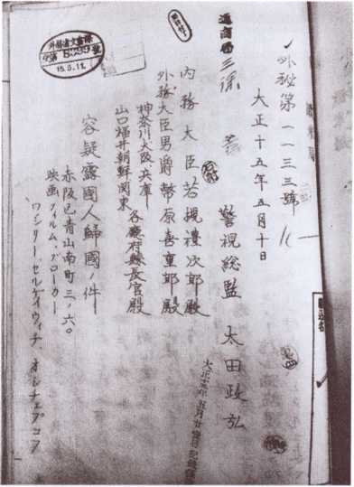 Рапорт по наблюдению за Ощепковым тайной полиции токко. Весна 1926 г. Архив МИД Японии