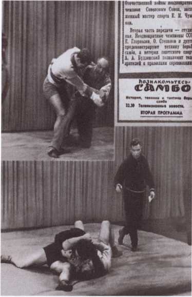 Анонс первой в истории телепередачи с раскрытием имени Василия Ощепкова как создателя борьбы самбо. На татами — его ученик Андрей Будзинский и диктор Центрального телевидения Виктор Балашов. 1960 г.