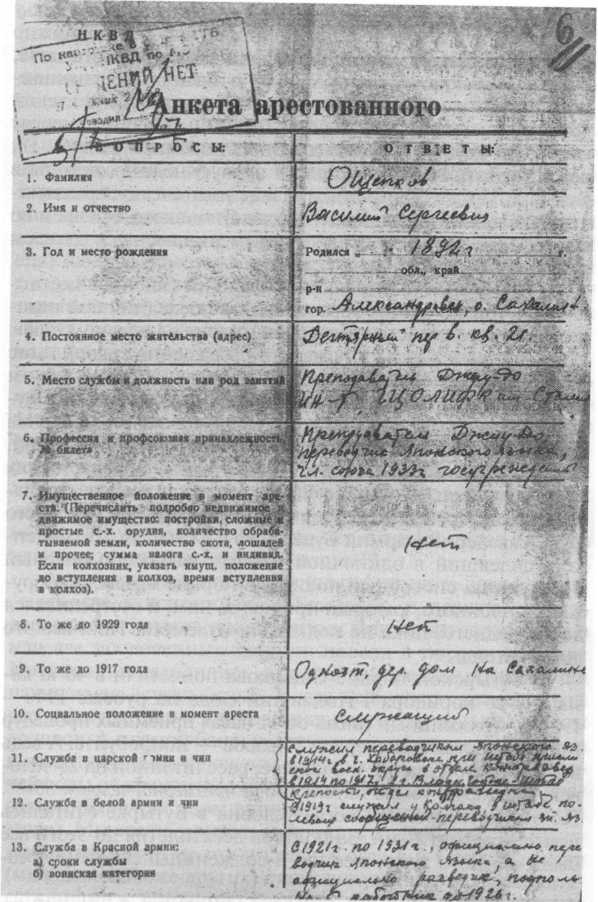 Анкета арестованного В. С. Ощепкова. ГАРФ.