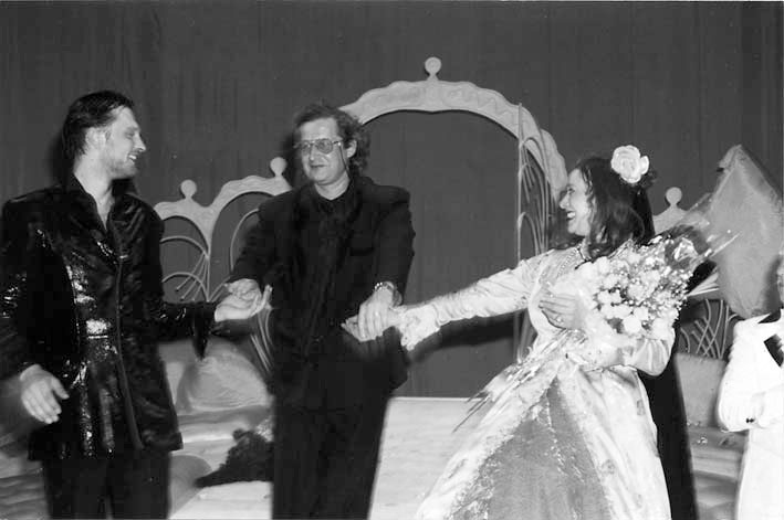 С Александром Домогаровым и Андреем Житинкиным. Финал спектакля «Милый друг» в театре им. Моссовета, 1997 г.