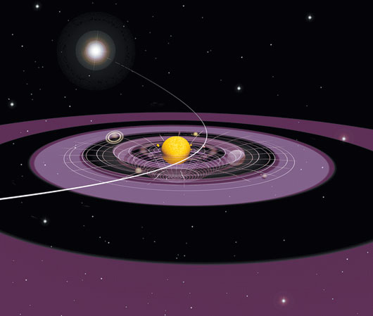 Гравитационное поле массивного тела, например, Солнца, искривляет траекторию света далекой звезды.