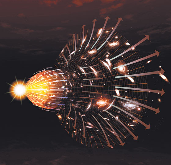 На этой иллюстрации слева направо – триллионные доли секунды после Большого взрыва, когда Вселенная инфляционно расширяется от размеров меньше атома с массой пакетика сахара до диаметра галактики.