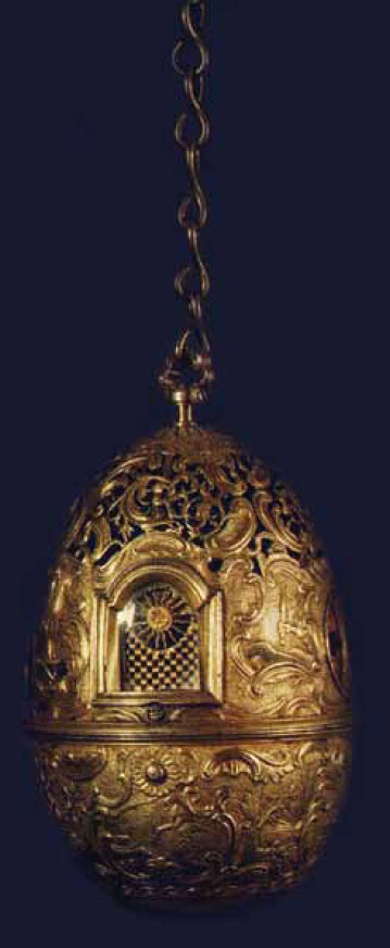 В начале 1767 г. в Нижний прилетела весть, что караван судов императрицы начал движение из Твери вниз по Волге. К Кулибину прибыл нарочный от губернатора с приказом изготовить часы для подарка царице не позже 20 мая. Кулибина взяла оторопь – часы были еще не готовы, а времени оставалось всего ничего. Тем не менее мастер засел за инструменты и работал не покладая рук сутки напролет. 20 мая императрица прибыла в Нижний с многочисленной свитой. Уже на следующий день Кулибин и Костромин ожидали высочайшей аудиенции в приемной губернатора. Сначала с ними поздоровался директор Академии наук граф Владимир Орлов, входивший в ближайшее окружение императрицы. Граф быстро перевел разговор на кулибинские изобретения, благо мастер принес с собой микроскоп, телескоп и подзорную трубу. Орлов осмотрел приборы и остался доволен. Затем он провел Кулибина в покои царицы (купца монаршей аудиенции не удостоили). Екатерина II любезно поздоровалась с Кулибиным, велела ему тотчас же подняться с колен и представить ей свои изобретения. Владимир Орлов напомнил, что мастер хотел также подарить государыне диковинные часы собственной работы. Кулибин, несколько смутившись, доложил царице, что часы еще не совсем готовы, однако достал их из кармана и вручил Екатерине. Впоследствии эти часы, совсем уже оконченные, вместе с подробным их описанием окажутся на хранении в Эрмитаже. Вот как описывает уникальные часы писатель-нижегородец Николай Кочин: «Часы получились видом и величиною между утиным и гусиным яйцом, были заключены в золотую оправу. Они состояли из тысячи мельчайших деталей, заводились раз в сутки и отбивали положенное время, даже половины и четверти. На исходе каждого часа в этом яйцеобразном автомате отворялись створчатые дверцы, и внутри глазам представлялся золоченый «чертог», в котором разыгрывалась целая мистерия. Против дверей «чертога» стояло изображение «гроба господня». По сторонам гроба стояли с копьями два воина. Через полминуты, как отворились двери «чертога», являлся ангел. Дверь, ведущая к гробу, раскрывалась, а стоящие воины падали ниц… Раз в сутки – в полдень – часы играли оду, сочиненную самим Кулибиным в честь прибытия царицы в город».
