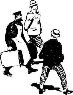 Сначала в толпе людей в куртках из чертовой кожи и холщовых рубахах ничего нельзя было разобрать. Потом, возвышаясь над всеми, мелькнула кудрявая голова Кости Фоменко. Он крепко держал за воротник сиреневого сюртука тощего субъекта со светлыми баками. Субъект извивался, как червяк. При этом он, видимо, пытался сказать что-то, так как рот его то и дело открывался.