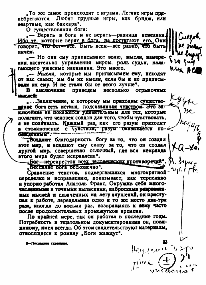 «Бог – перекресток всех человеческих противоречий», – сделал вывод Франс. Сталин согласно подчеркнул его и направил две стрелки. Одну к тезису Франса: «…существование бога есть истина, подсказанная чувством. Это заключение не покажется удивительным для тех, которые полагают, что человек создан для того, чтобы чувствовать, а не познавать. Каждый раз, как его разум приходит в столкновение с чувством, разум оказывается побежденным». Второй стрелкой закольцевал уже эти два тезиса, а сбоку, слегка ерничая, приписал: «Куды ж податься!»