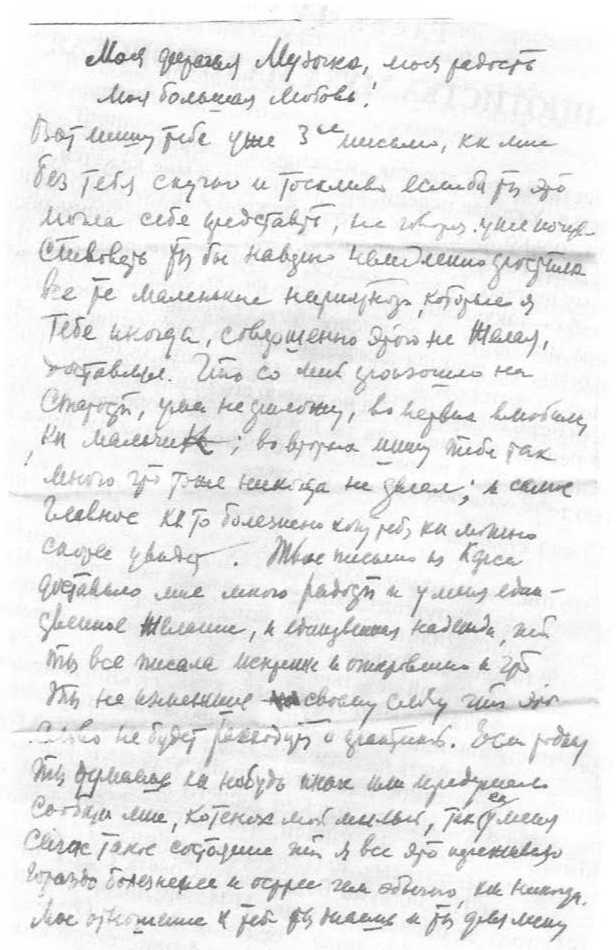 «Здравствуй, моя дорогая, маленькая девочка — моё большое счастье. Уже две недели, как ты уехала, а мне кажется, что это было только вчера: так остро и тяжело я переживаю нашу разлуку. Даже сейчас, когда пишу это письмо, я прислушиваюсь к каждому шороху. И мне кажется, что вот-вот ты войдешь, и я увижу тебя — такую близкую, такую родную. Меня очень тревожит твоё молчание. В чём дело? Может быть, ты передумала, может быть, ты решила изменить данное мне обещание. Моё решение, о котором я тебе говорил, сегодня остается также твердо и без изменений. И я не думаю его менять. Сообщи, родная, с первой оказией, как ты доехала, как здоровье, как твои близкие, как тебя встретили, что будешь делать. Ну, пока всё. Целую тебя, моя родная, моё счастье.