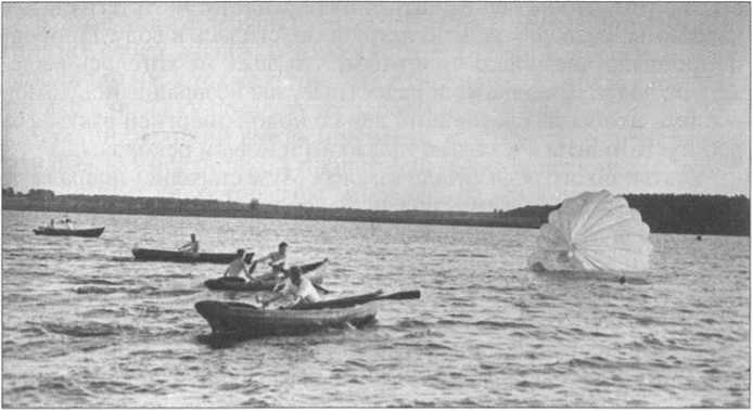 25 июня утром мы узнали, что вечером будет прыжок в воду. Я была очень обрадована. Несмотря на то, что почти все мои прыжки были экспериментальными, в воду прыгать мне ещё не приходилось. Мы летели над Сенежским озером, и я видела внизу целую флотилию лодок. По команде Шмидта я вылезла на крыло и пошла вниз. Самое главное в момент приводнения было в том, чтобы освободиться от парашюта. Я отстегнула все карабины, развернулась по ветру и опустилась в воду. Приводнение было настолько приятным, что даже не хотелось вылезать из воды. Довольные и радостные, мы возвращались домой — с тем, чтобы на следующий день с новой энергией взяться за работу. Готовиться к новым прыжкам и новым рекордам…»