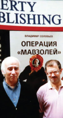 Владимир Соловьев & Вагрич Бахчанян на книжной ярмарке на Пятой авеню перед огромным макетом с обложкой моего футуристского романа «Операция МАВЗОЛЕЙ». Нью-Йорк, 1989.