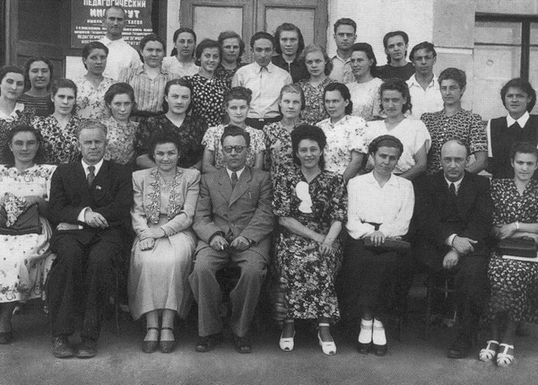 М. М. Бахтин (второй справа в нижнем ряду) среди студентов и преподавателей МГПУ. Фото. Июнь 1953 г.