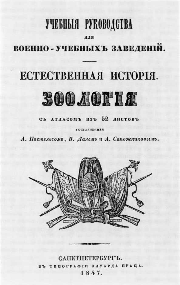 Зоология и ботаника занимали в программе значительное место. Учебники по этим предметам, написанные В.И. Далем, - некоторый итог его деятельности как натуралиста в Оренбургском крае. В 1847 г. была опубликована “Зоология” [119], которую В.И. Даль написал в соавторстве с известным педагогом и натуралистом А.Ф. Постельсом, участником кругосветного путешествия под руководством Ф.П. Литке и действительным членом Русского Географического общества. Иллюстрации к учебнику, составившие атлас в 52 листа, принадлежали художнику А.П. Сапожникову, при изображении животных учитывались указания академика Бэра. Вторым изданием учебник вышел в 1852 г.