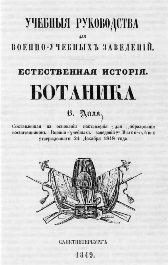 Биологией В.И. Далю пришлось заняться серьезно, когда он был, как сказано в его формулярном списке, “приказом главного начальника военно-учебных заведений 27 марта 1847 г. назначен редактором и составителем руководства естественной истории для военноучебных заведений”. Управление военно-учебными заведениями - губернскими, дворянскими, кадетскими корпусами (кроме Морского корпуса) - с 1833 г. было предоставлено великому князю Михаилу Павловичу. Обучение в них разделялось на три курса: приготовительный, общий и специальный. В приготовительном имелось в виду “постепенное развитие умственных способностей, изучение отечественного языка, естественной истории, изустного исчисления и практическое изучение иностранных языков”. Второй курс “обнимал все предметы общего образования - закон Божий, арифметику, алгебру, геометрию, зоологию, ботанику, минералогию, физику, географию, всеобщую историю, практическое изучение языков и пр.”. Наконец, высший курс включал науки, необходимые для военного звания и “предметы, которые требуют высшие общественные должности: тактика, артиллерия, фортификация, химия, статистика европейская и отечественная, новейшая история, законоведение и пр.”.