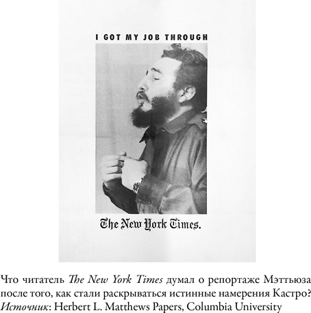 Мэттьюз поспешил в Нью-Йорк вместе с Нэнси, которая пронесла его заметки через пост охраны в гаванском аэропорту у себя под «грацией». Дома он написал ряд статей, первая из которых была помещена на самое видной место в воскресном выпуске The Times. Подзаголовок гласил, что «Кастро жив и по-прежнему сражается в горах»{28}. Вторая статья принижала роль коммунистов в противостоянии с Батистой, а третья говорила о том, что целью Кастро является не просто смещение Батисты, а глубокие социальные изменения.
