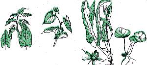 б) форма листьев и окраска те же, но молодые листья у поверхности коричневатые, плавающих обсыхающих листьев не дает, на цветоножке стрелковидный конус, из которого разворачиваются листья молодого растения, корневище на цветоножке не образуется;